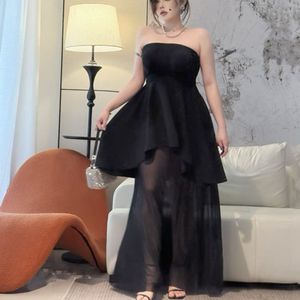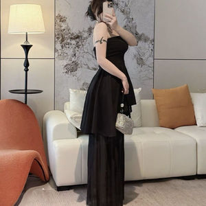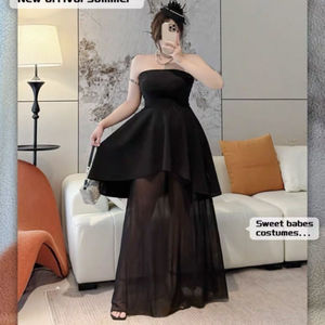 300斤大码胖mm气质显夏季网纱拼接抹胸连衣裙别致黑色包臀长裙