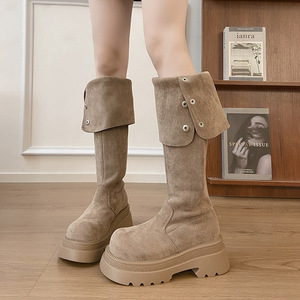 小个子增高过膝高筒靴女2025秋季新款复古方跟厚底显瘦套筒时装靴