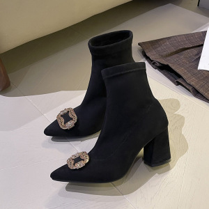 尖头绒面秋冬新款时尚高跟短靴女水钻方扣低筒时装靴纯色瘦瘦靴子