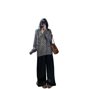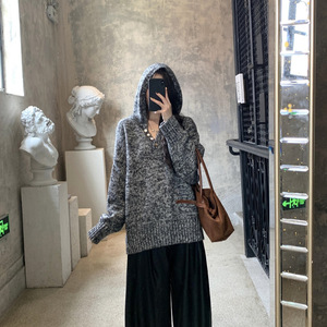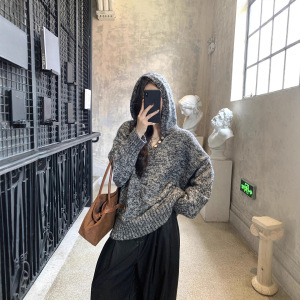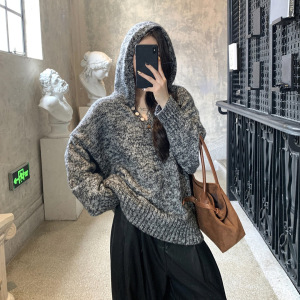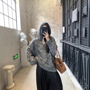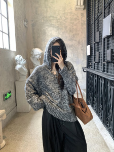 外贸秋冬新款花式纱线连帽贝壳扣针织慵懒风软糯毛衣女百搭上衣女