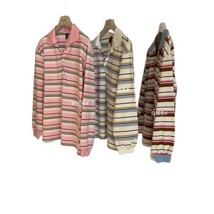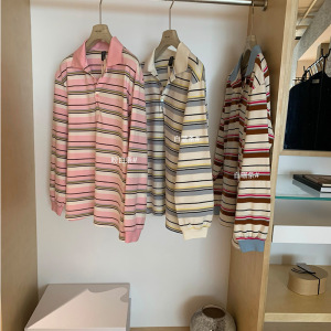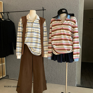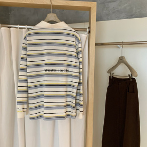 WGWE7024法式学院风撞色polo领宽松休闲长袖条纹T恤上衣