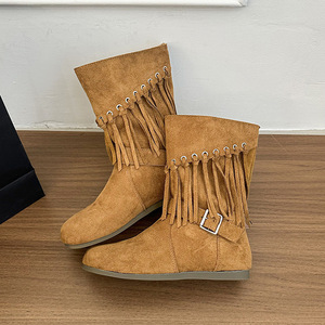 粗跟复古西部牛仔靴女2025新款穿搭时尚中筒流苏骑士靴