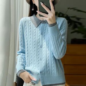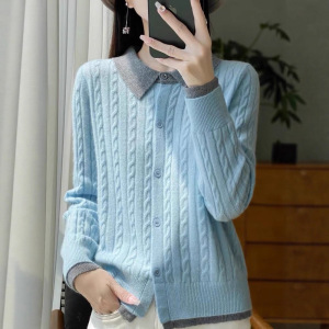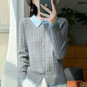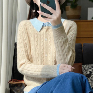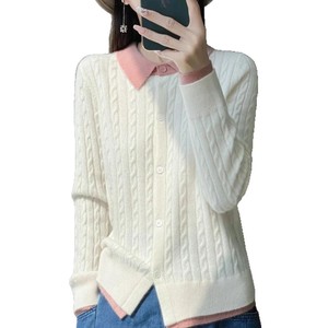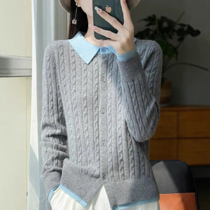 假两件翻领扭花拼色毛衣女开衫新款秋冬季宽松时尚针织打底衫外穿