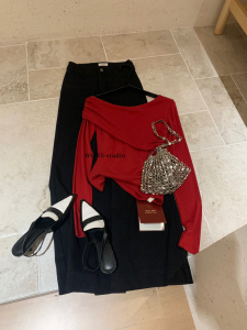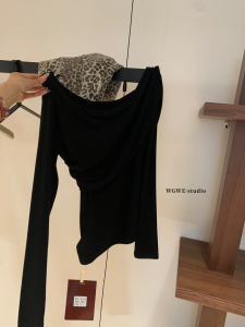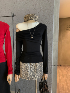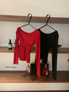 WGWE秋季韩系简约辣妹设计感褶皱百搭显瘦减龄斜肩长袖T恤女W7121
