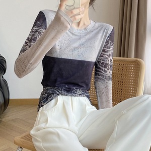 东南亚2025秋新款定位网纱印花圆领长袖t恤女时尚修身打底衫潮