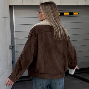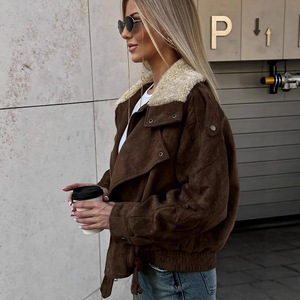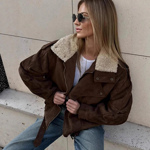 跨境欧美女装夹克复古外套时尚休闲外贸棕色大码宽松女士短款外套