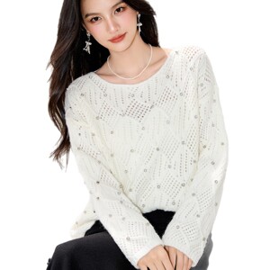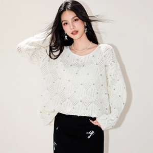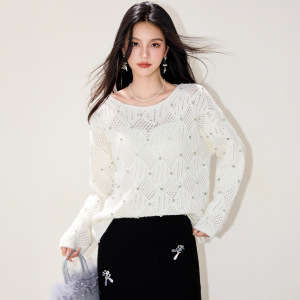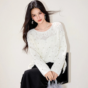 法式白色镂空长袖针织毛衣女春秋软糯宽松加厚罩衫外搭上衣秋冬