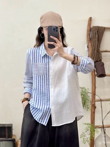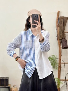 2025年春秋新款双层棉纱衬衫女长袖文艺复古宽松休闲条纹衬衣拼接
