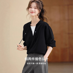 撞色拼接假两件上衣2025秋季新款休闲慵懒风宽松舒适卫衣