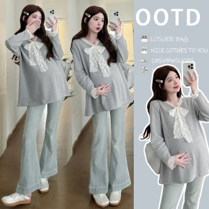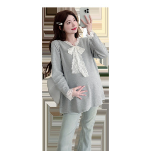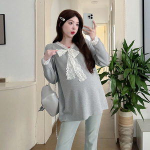 孕妇长袖T恤2025秋装孕妇上衣甜美蕾丝蝴蝶结拼接针织孕妇打底衣