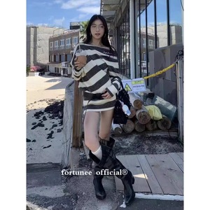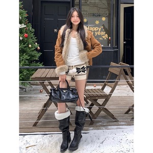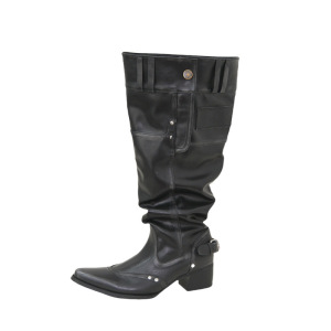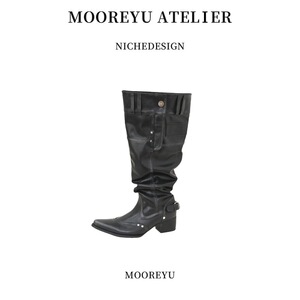羊皮版~复古尖头西部牛仔靴显瘦褶皱堆堆靴女粗跟气质不过膝长靴