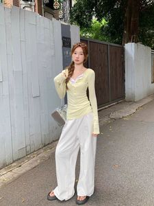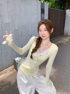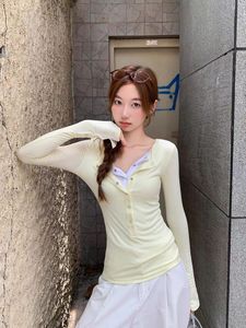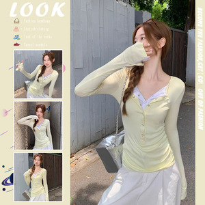 纯欲风假两件半开领长袖T恤女2025秋新款修身显瘦内搭打底衫上衣