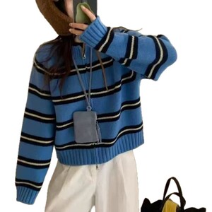 圆领撞色条纹双拉链针织衫外套女2025秋冬款韩系慵懒风针织衫上衣