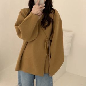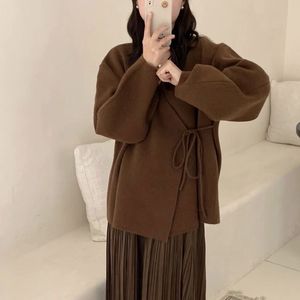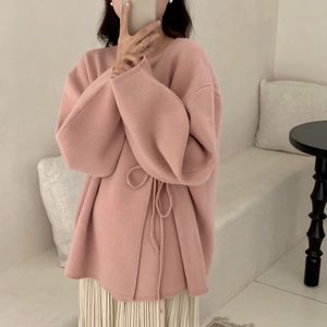 设计感小众粉色毛衣外套开衫女秋冬新款加厚宽松慵懒风系带针织衫