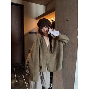 实拍~早秋V领长袖针织开衫韩系慵懒毛衣+宽松阔腿百搭休闲裤套装