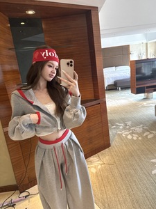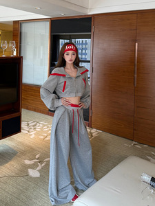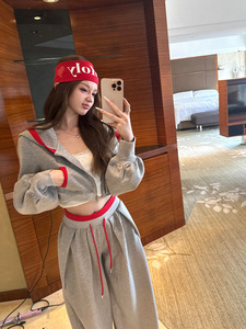 休闲套装女秋冬灰红拼色大兜连帽短款卫衣直筒宽松抽绳卫裤两件套