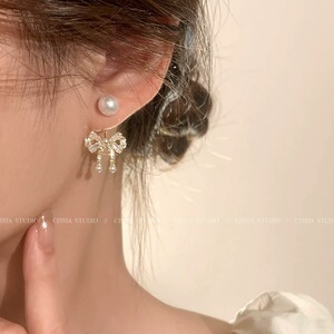 6#银色丝带蝴蝶结吊坠珍珠耳钉【两戴款】