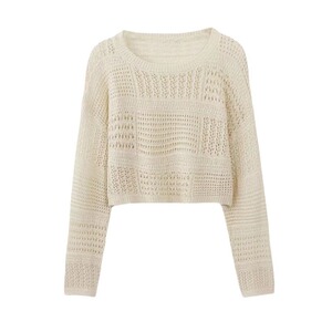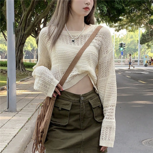 法式清新圆领钩花网纱上衣纯色配吊带镂空长袖针织罩衣女外穿薄款