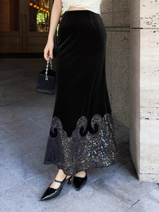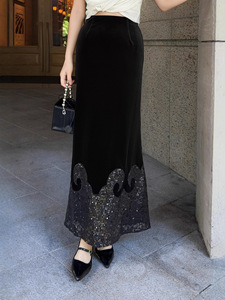 南油批发新款 醋酸丝绒拼接珠片刺绣高腰 鱼尾长裙侧拉链松紧腰头