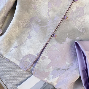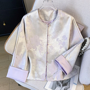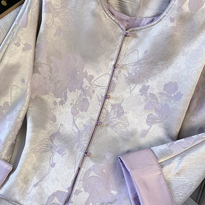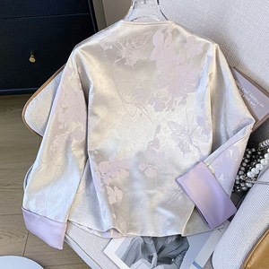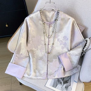 新款新中式重工提花拼接圆领缎面提花盘扣长袖复古改良民族风上衣