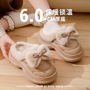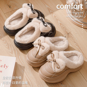 厚底高跟棉拖鞋女新款室内时尚百搭蝴蝶结PU拖鞋冬季保暖防滑外穿