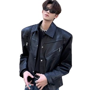 美式痞帅翻领机车夹克男2025秋季新款翻领机车服上衣垫肩皮衣外套