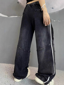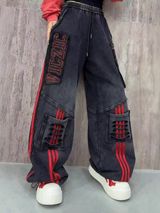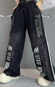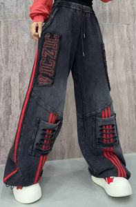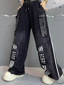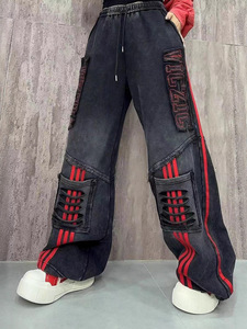 欧货休闲裤女2025秋季新款重工字母刺绣破洞杠条宽松带抽绳长裤潮