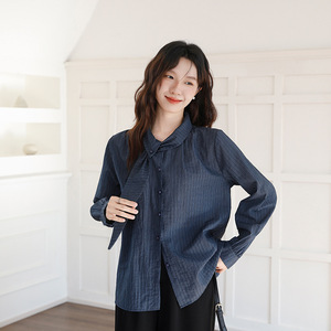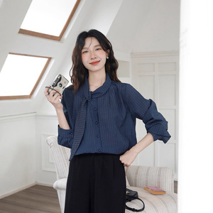 实拍 秋季法式竖条纹长袖衬衫宽松气质百搭飘带小众别致衬衣上衣