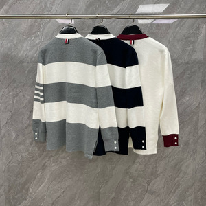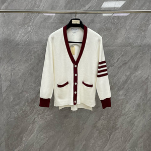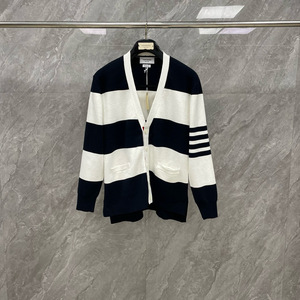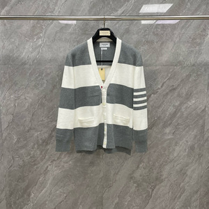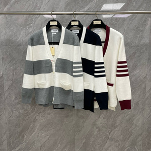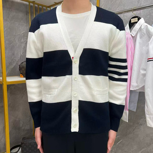 厂家直营TB秋季新款宽条纹撞色V领针织羊毛开衫男女同款休闲百搭