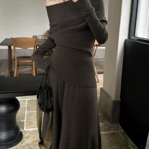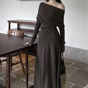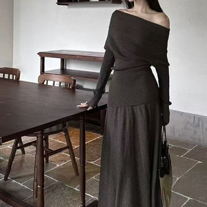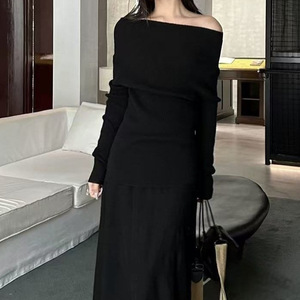 2025新款黑色针织感连衣裙女子中长裙套装纯色肩带款常规