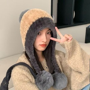 冬季防寒帽大头围毛绒挂球可爱护耳帽子女遮耳加绒加厚拼色针织帽