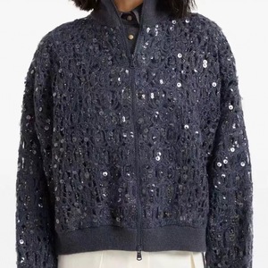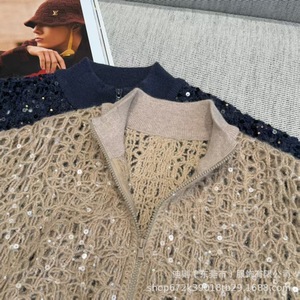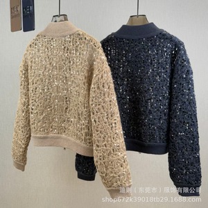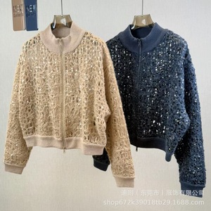 B*C 2025秋冬新款女装轻奢时尚立领珠片镂空钩花针织衫上衣外套