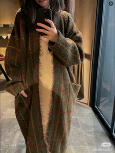 秋冬羊毛混纺红格纹风衣外套毛呢大衣女显瘦中长过膝呢子外套开衫