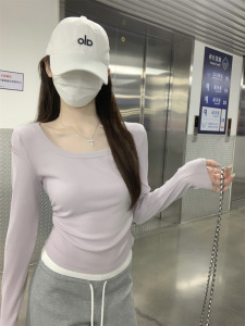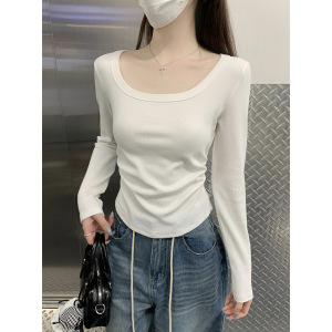 美式2025早秋韩版纯色基础百搭修身方领褶皱设计长袖内搭T恤上衣