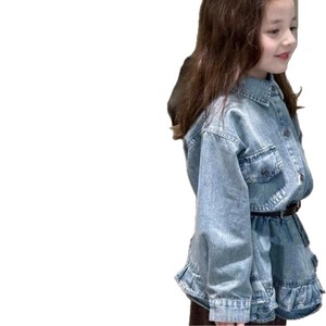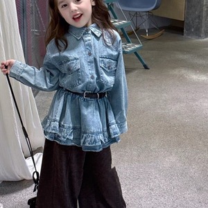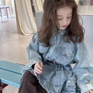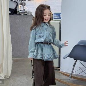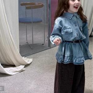 女童牛仔衬衫外套秋装2025女宝花边牛仔衬衣上衣中长款牛仔衣韩版
