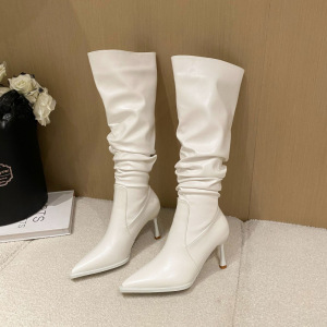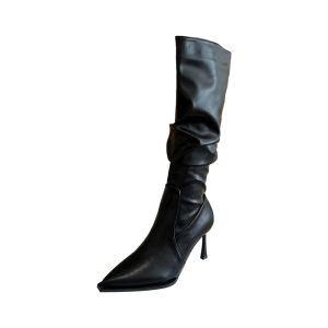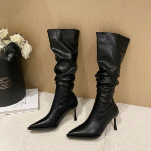 2025年秋冬季新款欧美尖头褶皱高筒长靴女细跟蛇纹堆堆靴高跟不过