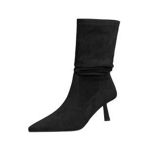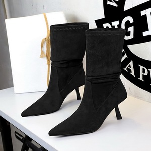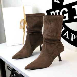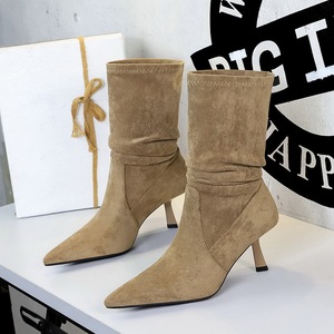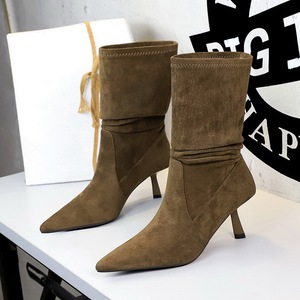 2738-3瘦瘦靴子女百搭美拉德中筒短靴弹力绒面单靴尖头褶皱堆堆靴