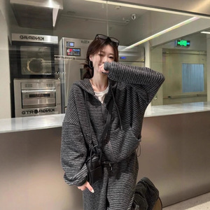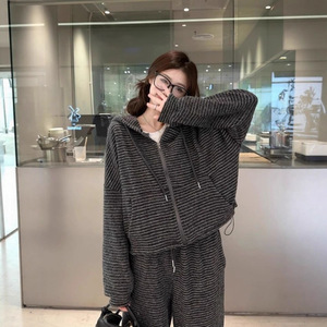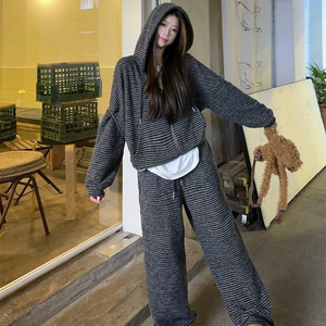 新款秋冬慵懒风套装宽松连帽条纹外套女秋冬直筒阔腿裤长裤两件套