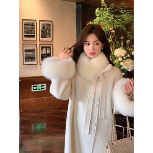 月光初雪 仿狐狸毛领毛呢大衣女蝴蝶结秋冬法式千金赫本中长外套