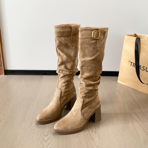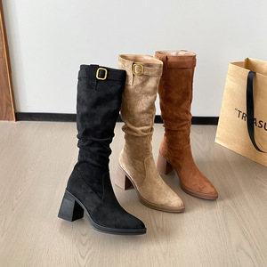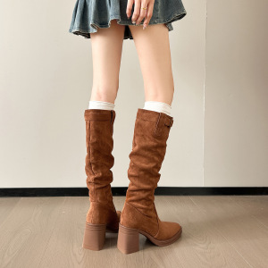 英伦风绒面高跟长靴子女2025秋冬新款皮带扣厚底粗跟高筒尖头靴
