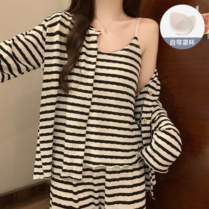 条纹三件套睡衣女春秋款带胸垫高级感吊带长袖长裤冬季外穿家居服
