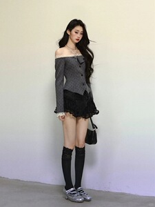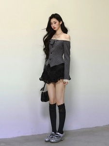 法式小香风甜辣一字领波点蝴蝶结设计感上衣女小众高腰半身裙套装