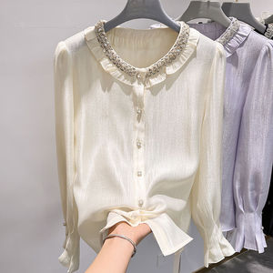 2025新款韩国气质圆领亮片钉珠边单排扣长袖雪纺衬衫女春季