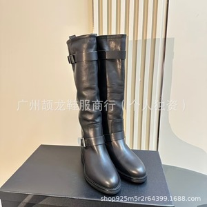 高端2025秋冬新款真皮圆头复古平跟皮带扣高筒骑士靴不过膝长靴女