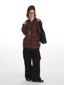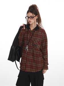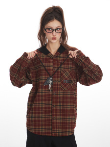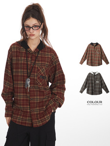 HeyHenry春秋季连帽复古格子长袖衬衫男女宽松慵懒休闲外套上衣