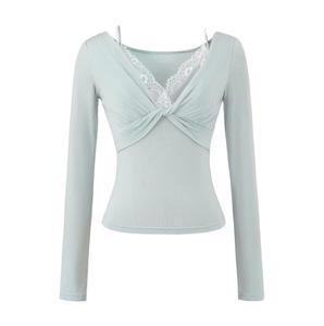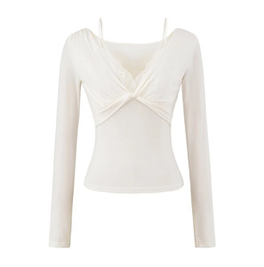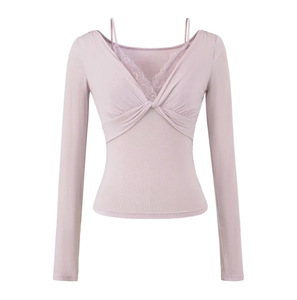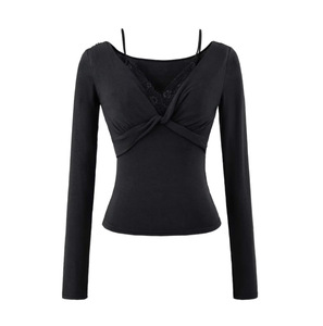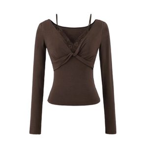 蕾丝拼接假两件长袖T桖女2025秋新款美式辣妹纯色修身内搭打底衫