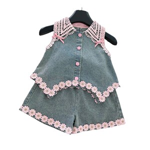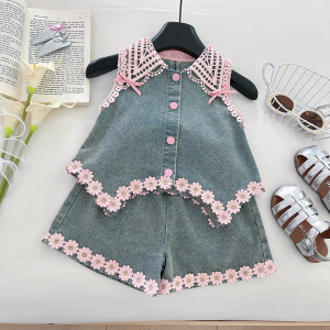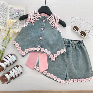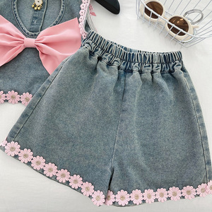 2025夏季新款女童牛仔套装洋气露背蝴蝶结花朵无袖上衣短裤两件套