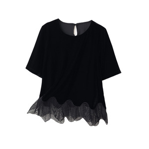 新设计感拼接欧蕾丝刺绣圆领气质花边上衣金丝绒大码透气T恤 大衫