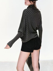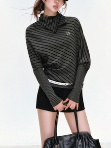 条纹针织翻领毛衣蝙蝠袖古早气质上衣慵懒宽松显瘦罩衫