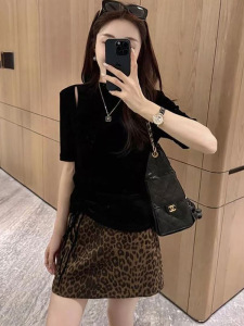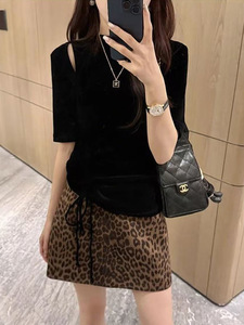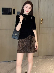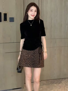 设计感抽绳中袖T恤+豹纹短裙两件套女2025秋季新款时尚气质上衣女
